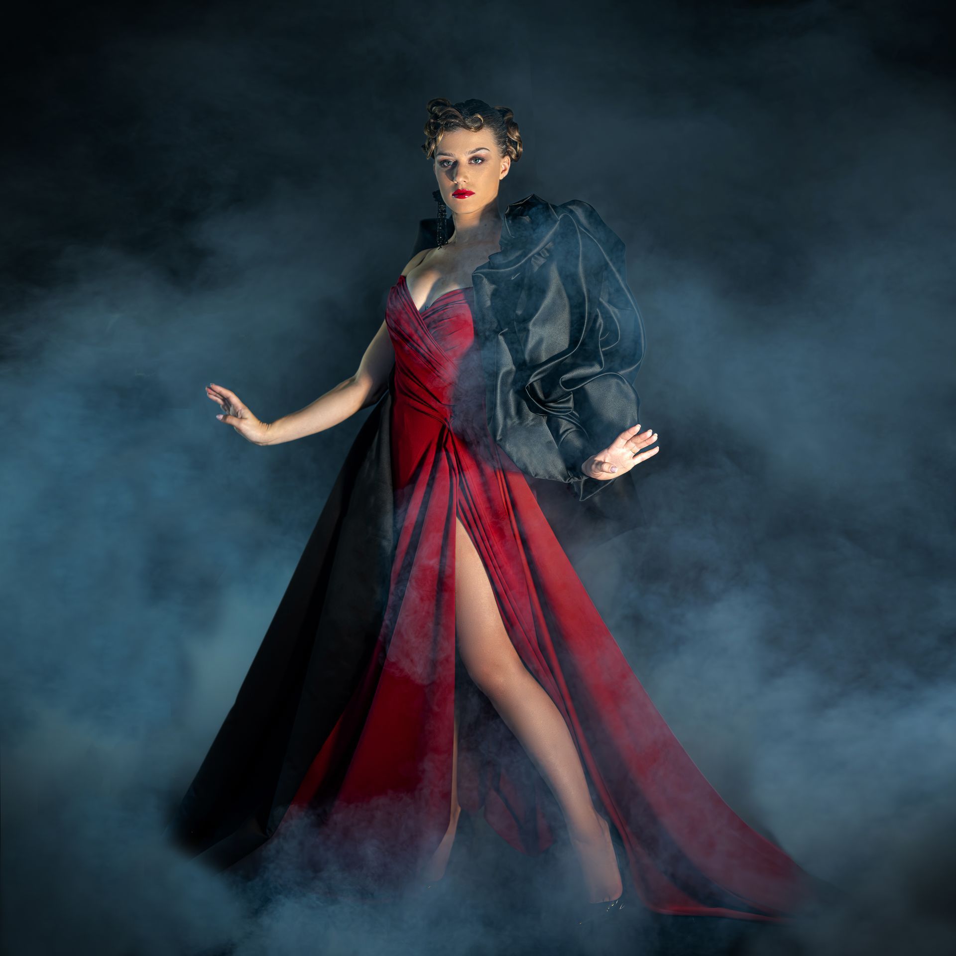 À l’occasion de la fête d’Halloween, cette création a été imaginée et immortalisée dans nos ateliers. Une robe flamboyante, où un drapé sombre se fond  avec le rouge vif de la rose, créant une symbiose entre mystère et passion.