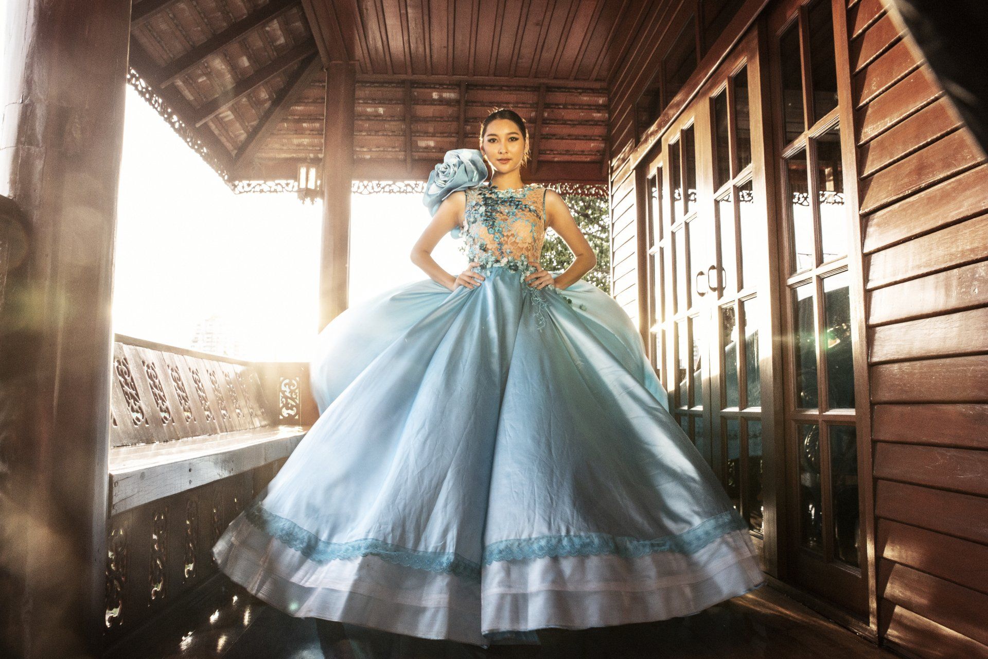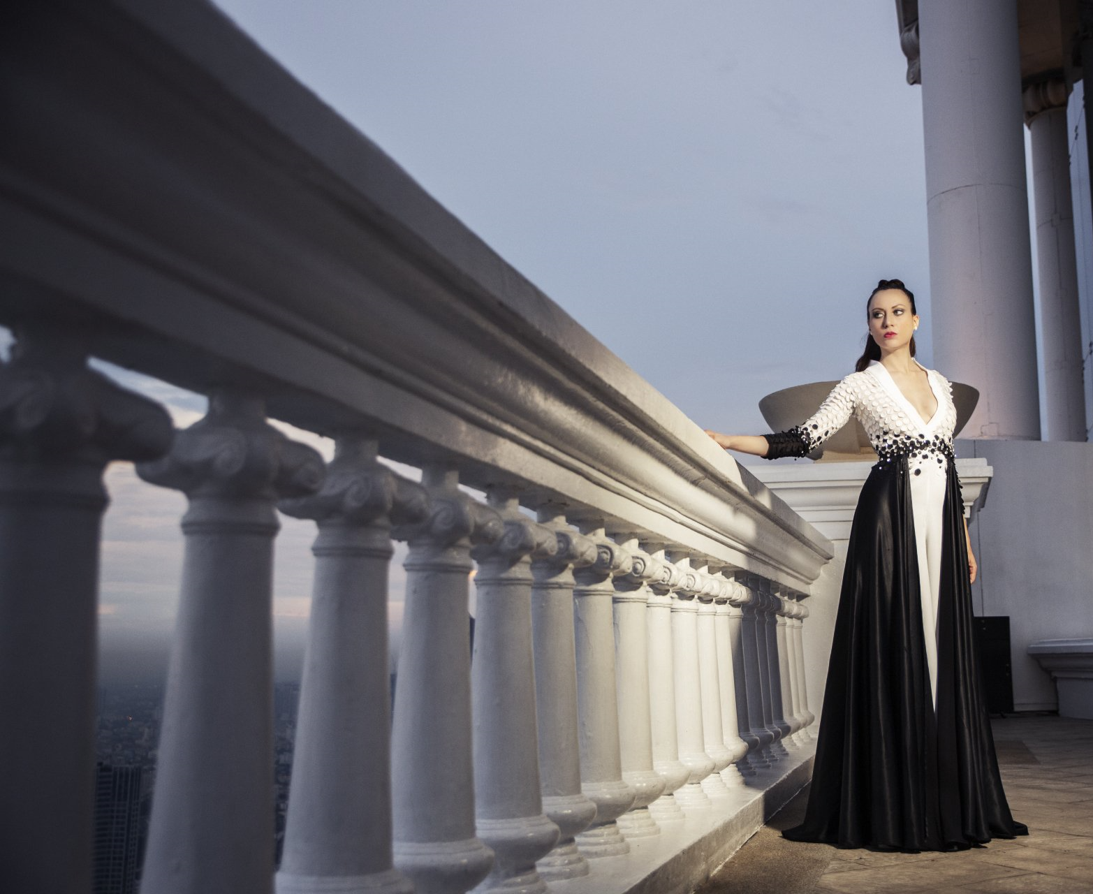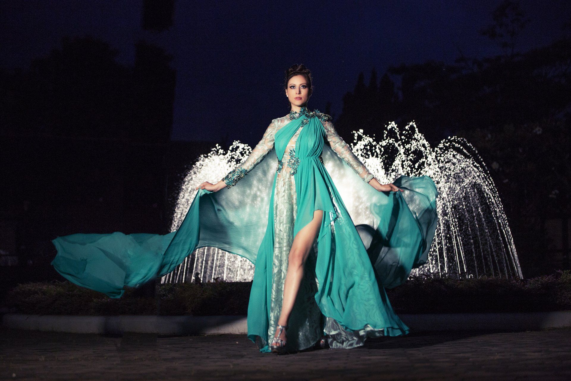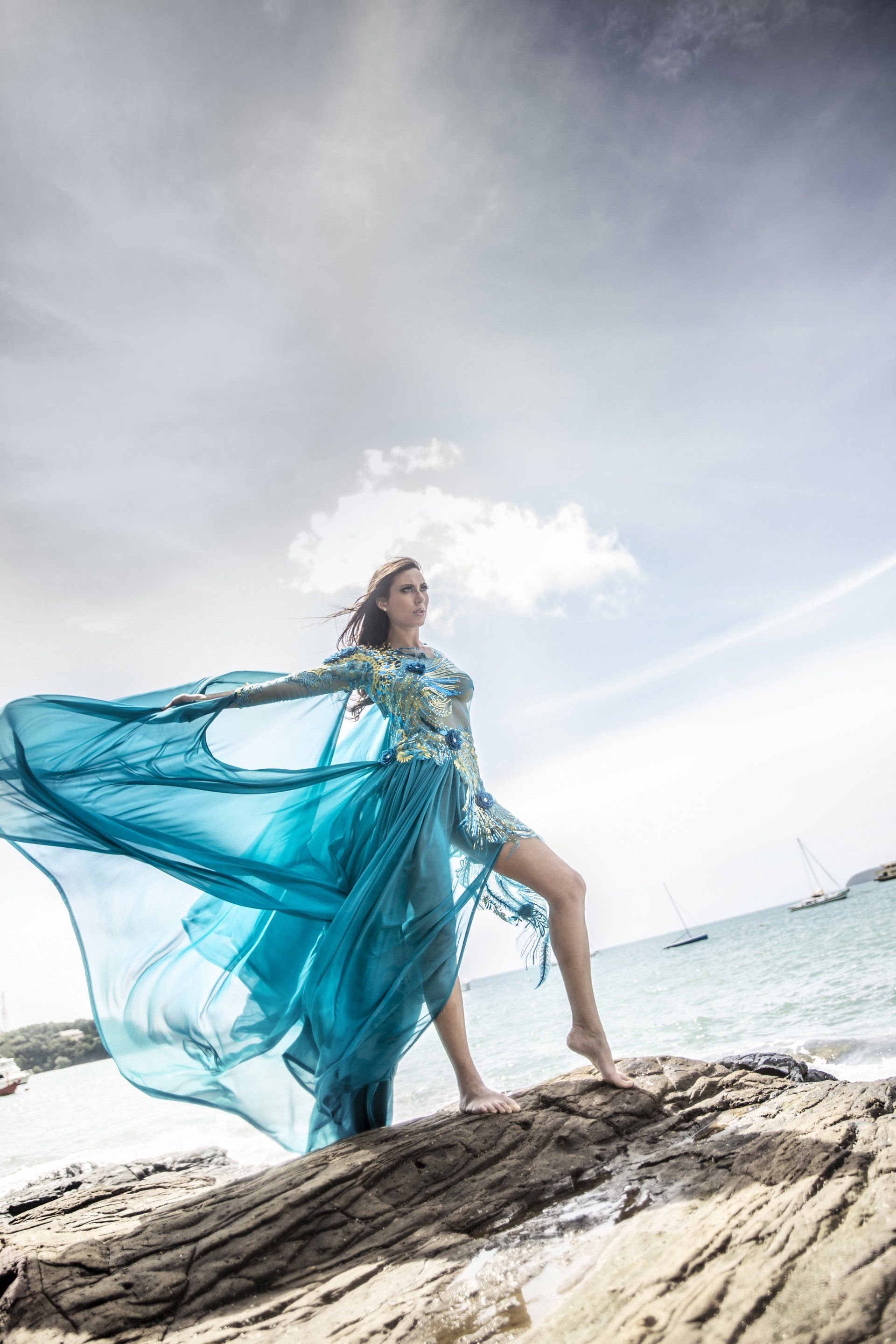 Romuald Bertrand presents two couture pieces, inspired by the paradisiacal beaches of Phuket. The first, ethereal and in shades of azure, captures the lightness of sails fluttering in the wind during a traditional Thai boat crossing. The second, a fluid composition with twilight reflections, evokes the warmth and serenity of sunsets, blending elegance with exoticism.