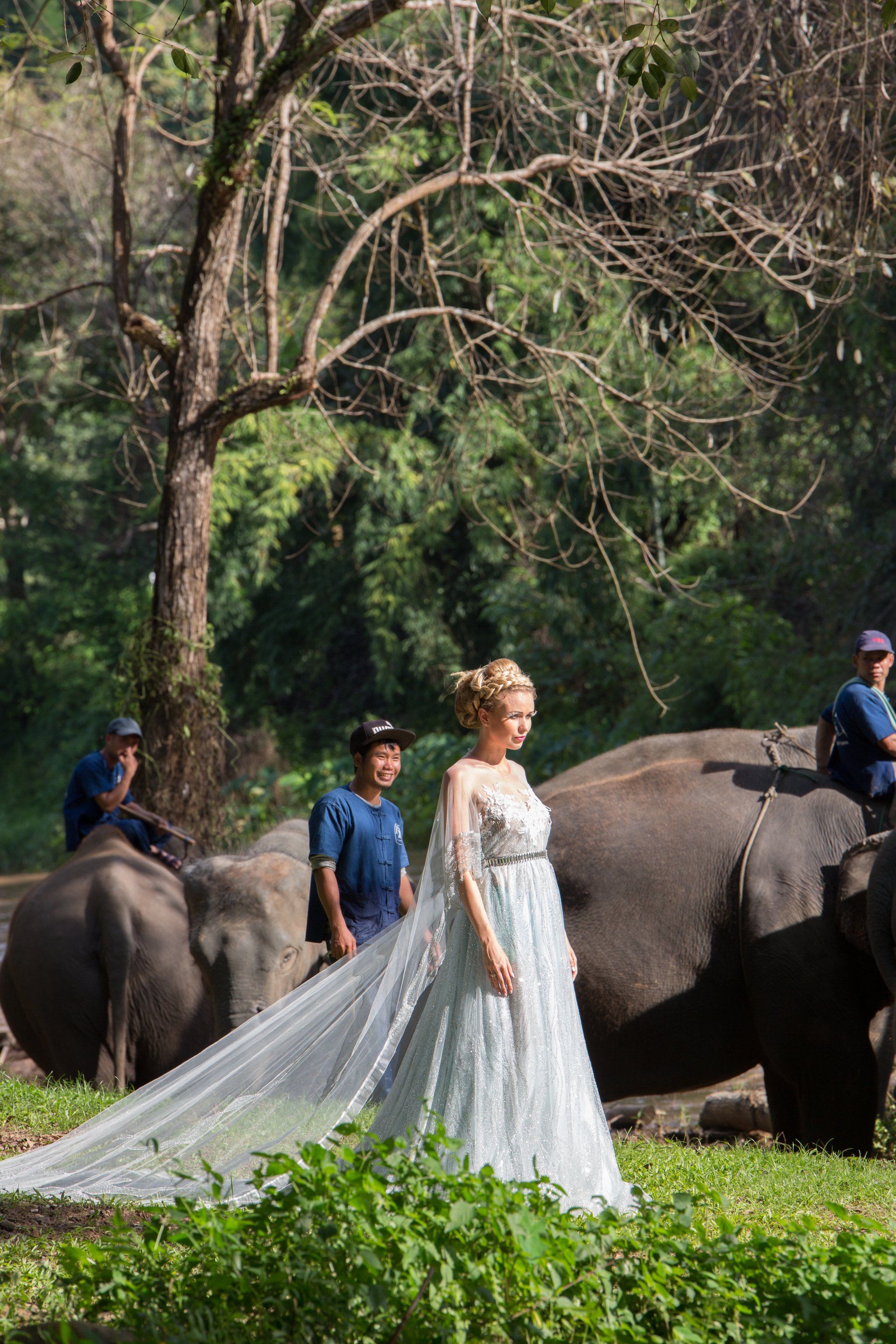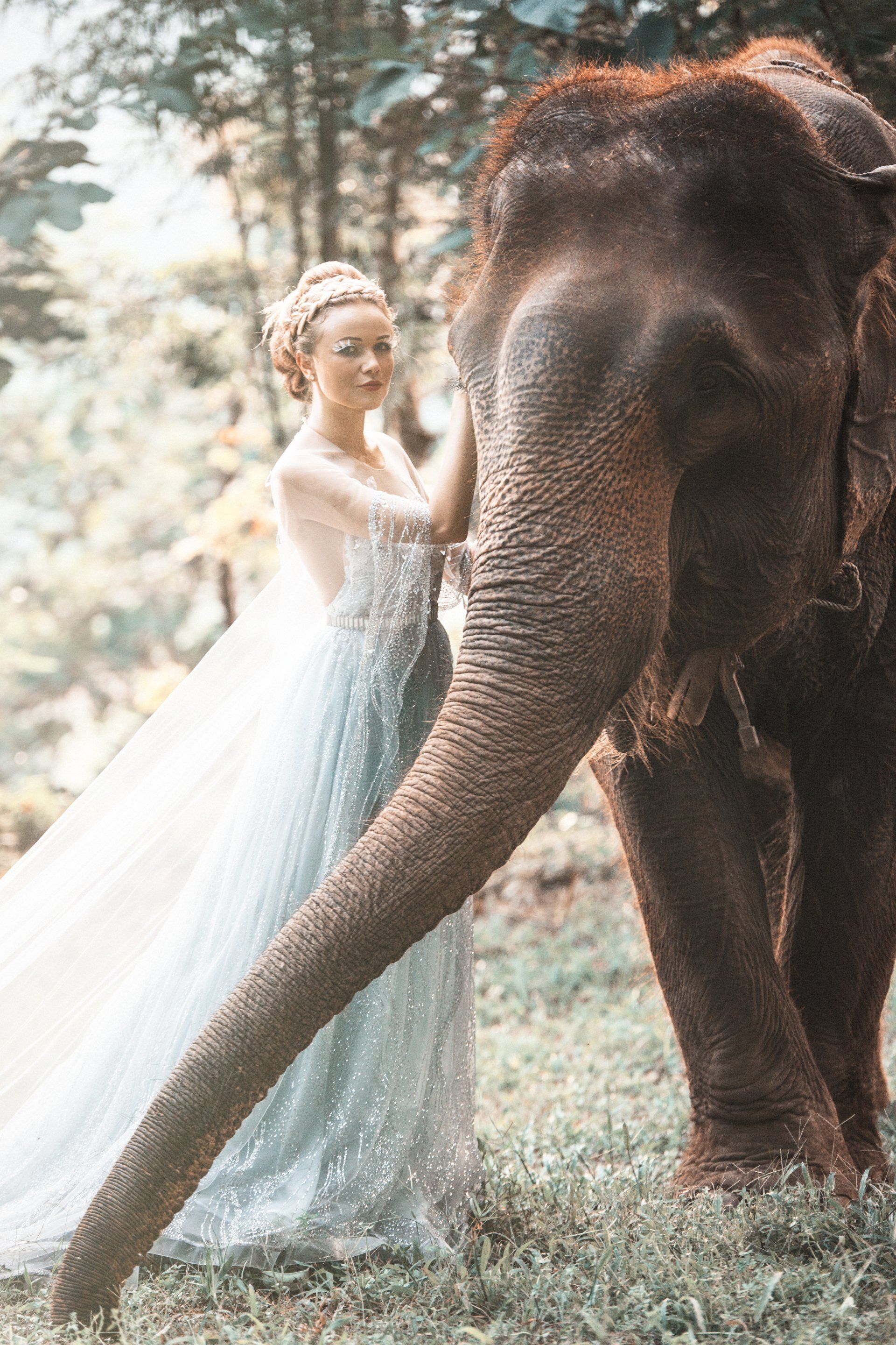 A true embodiment of elegance, power, and softness, with a princely silhouette, this wedding dress draws its elegance and history from the Thai Elephant Home, where rescued elephants peacefully roam. Their resilience bestows purity, strength, and lightness upon this creation by L'Engrenage.